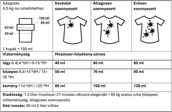A citrátok, a cukor felületaktív anyagok és szappan kombinációjának köszönhetően, a víz keménységétől függetlenül nem szükséges vízlágyítót alkalmazni a mosószer mellé.